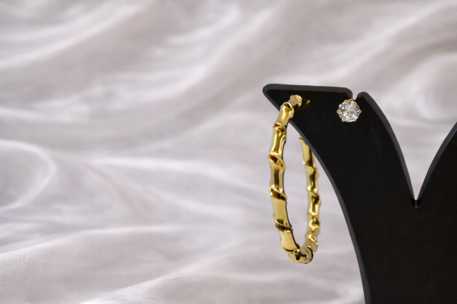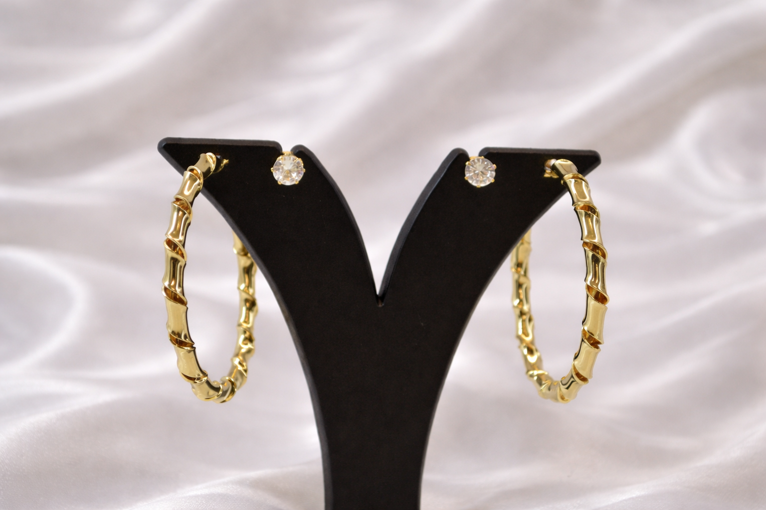 A stylish hoop stud earring inspired by bamboo detailing, finished in polished gold and accented with a sparkling crystal stud for a bold yet elegant look.