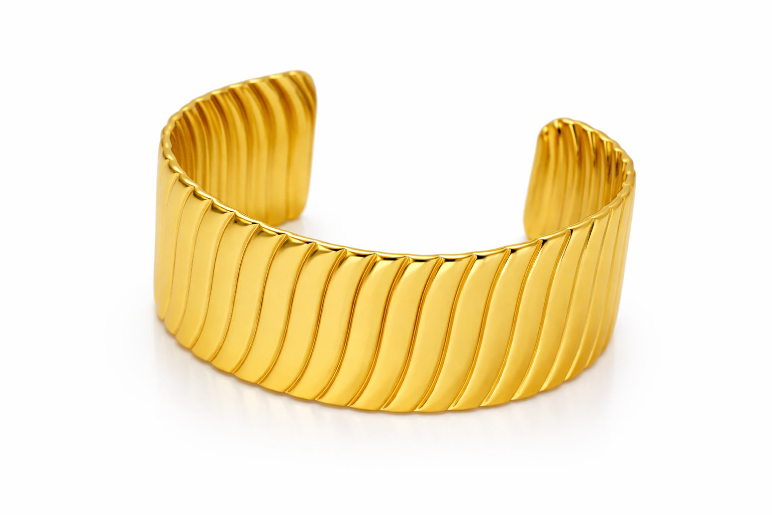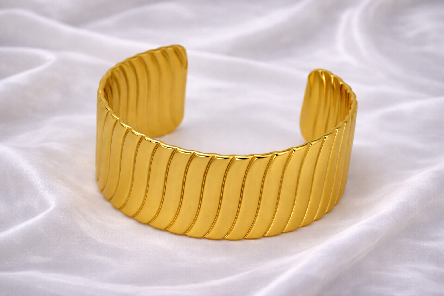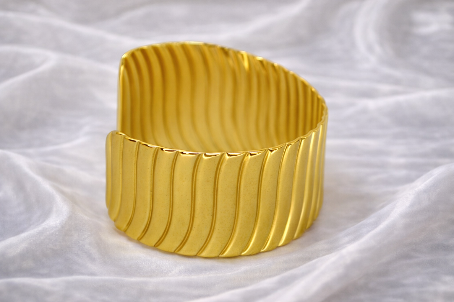 A striking wide cuff bracelet featuring sleek vertical ribbing and a smooth matte-polished gold finish, designed to deliver modern elegance with a bold, sculptural presence.