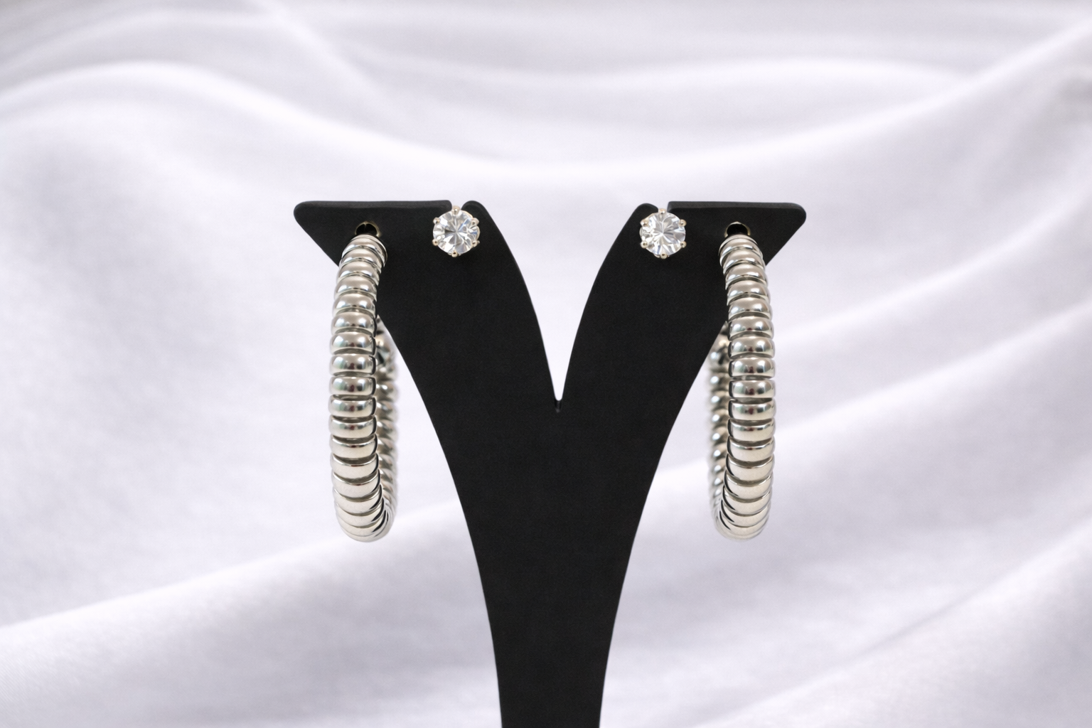 A sleek hoop stud earring with a ribbed silver finish and a subtle crystal accent, delivering modern shine with everyday sophistication.