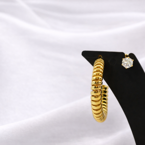 A striking wide cuff bracelet featuring sleek vertical ribbing and a smooth matte-polished gold finish, designed to deliver modern elegance with a bold, sculptural presence.