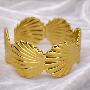 A statement cuff bracelet featuring layered shell-inspired fan motifs in a high-polish gold finish, designed to add sculptural elegance and bold sophistication to any look.