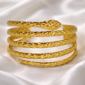 A striking coil bracelet inspired by a serpent form, featuring layered gold-tone loops with intricate textured detailing for a powerful, elegant statement look.