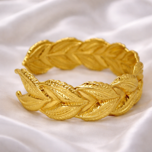 A refined cuff bracelet crafted with intricately layered laurel leaf motifs in a radiant gold finish, symbolizing timeless elegance and natural beauty.