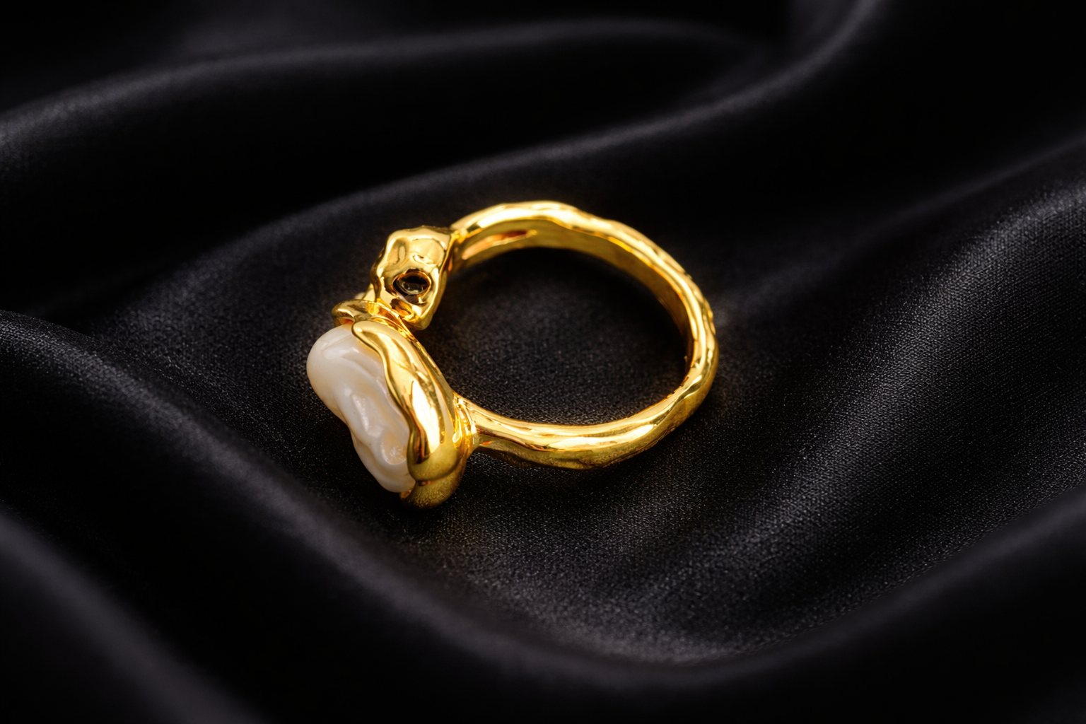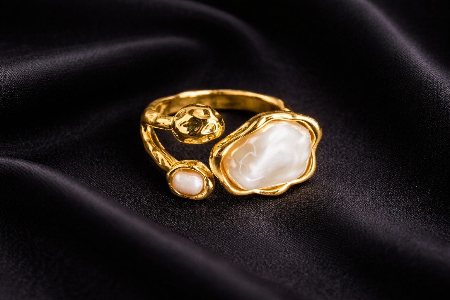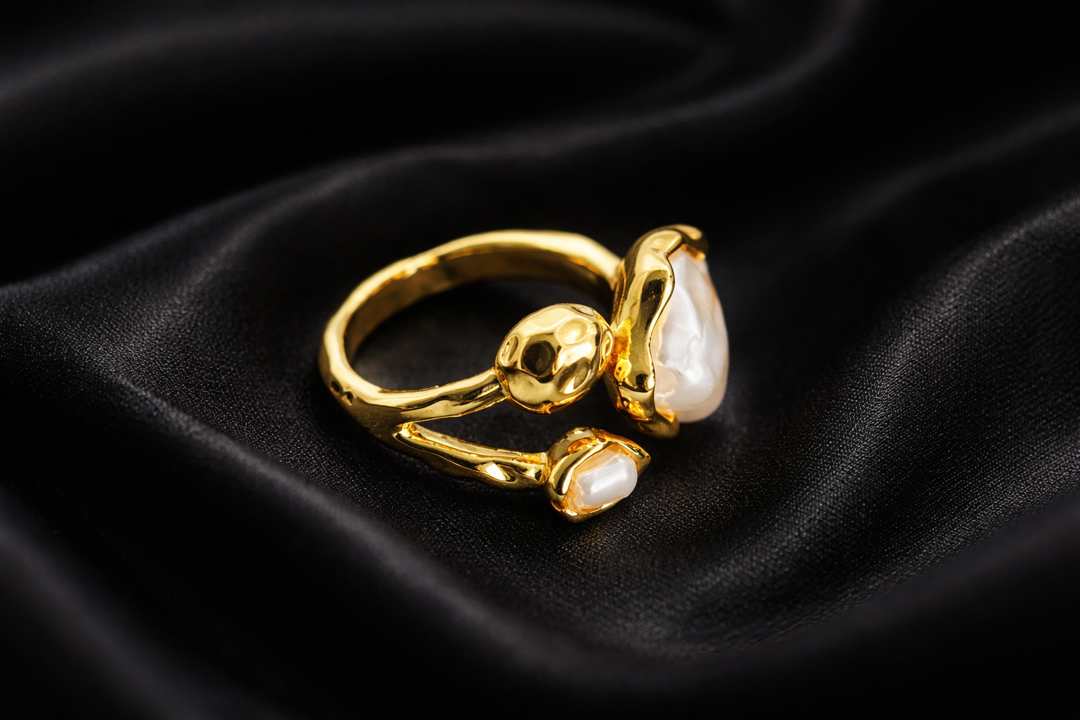 A bold expression of modern luxury, the Veloura Pearl Ring features sculpted gold textures paired with luminous baroque pearls—creating a statement piece that feels both artistic and elegant.