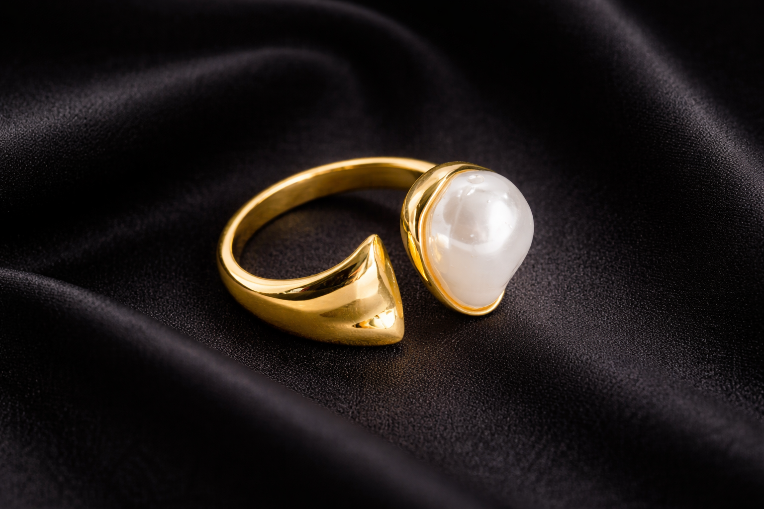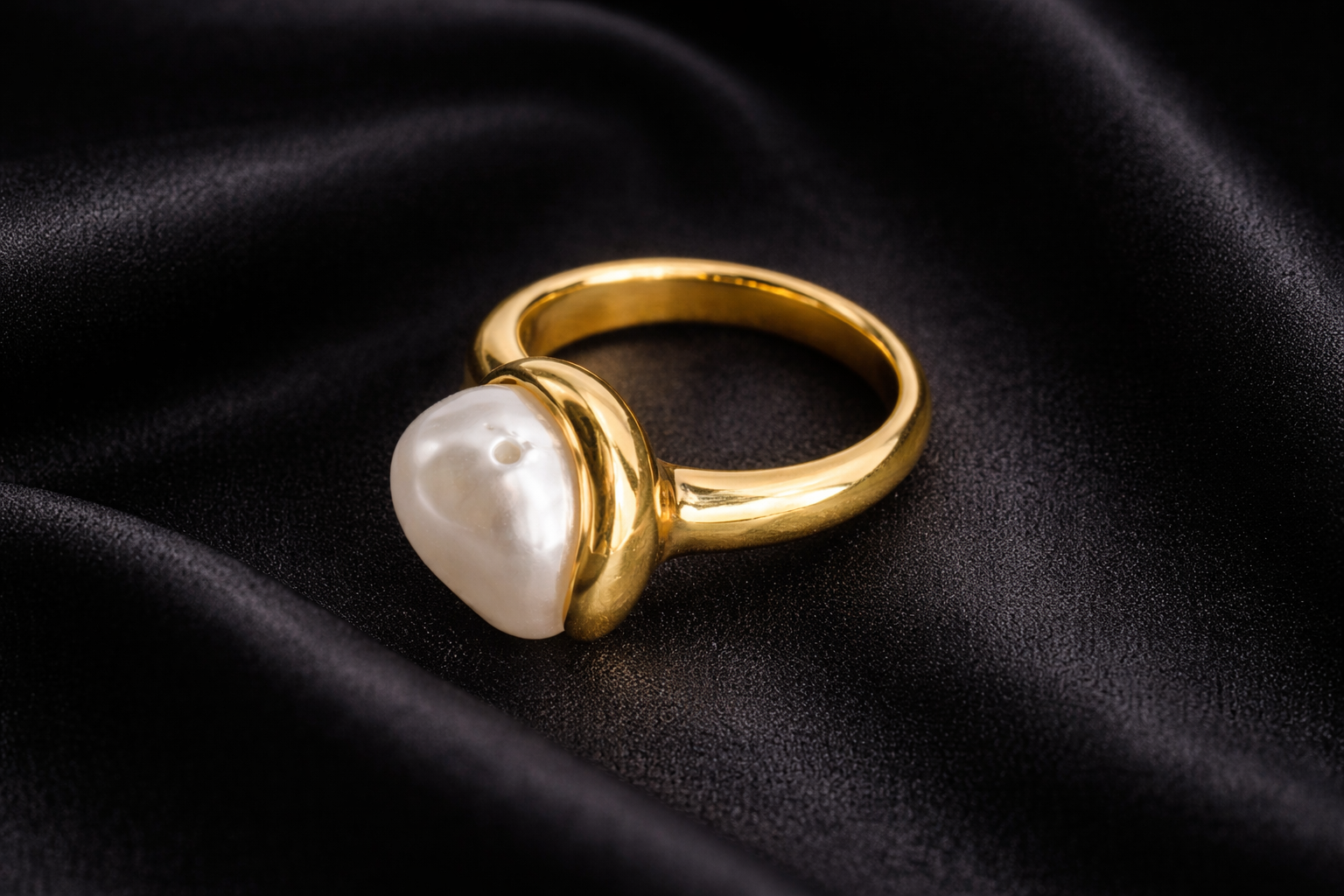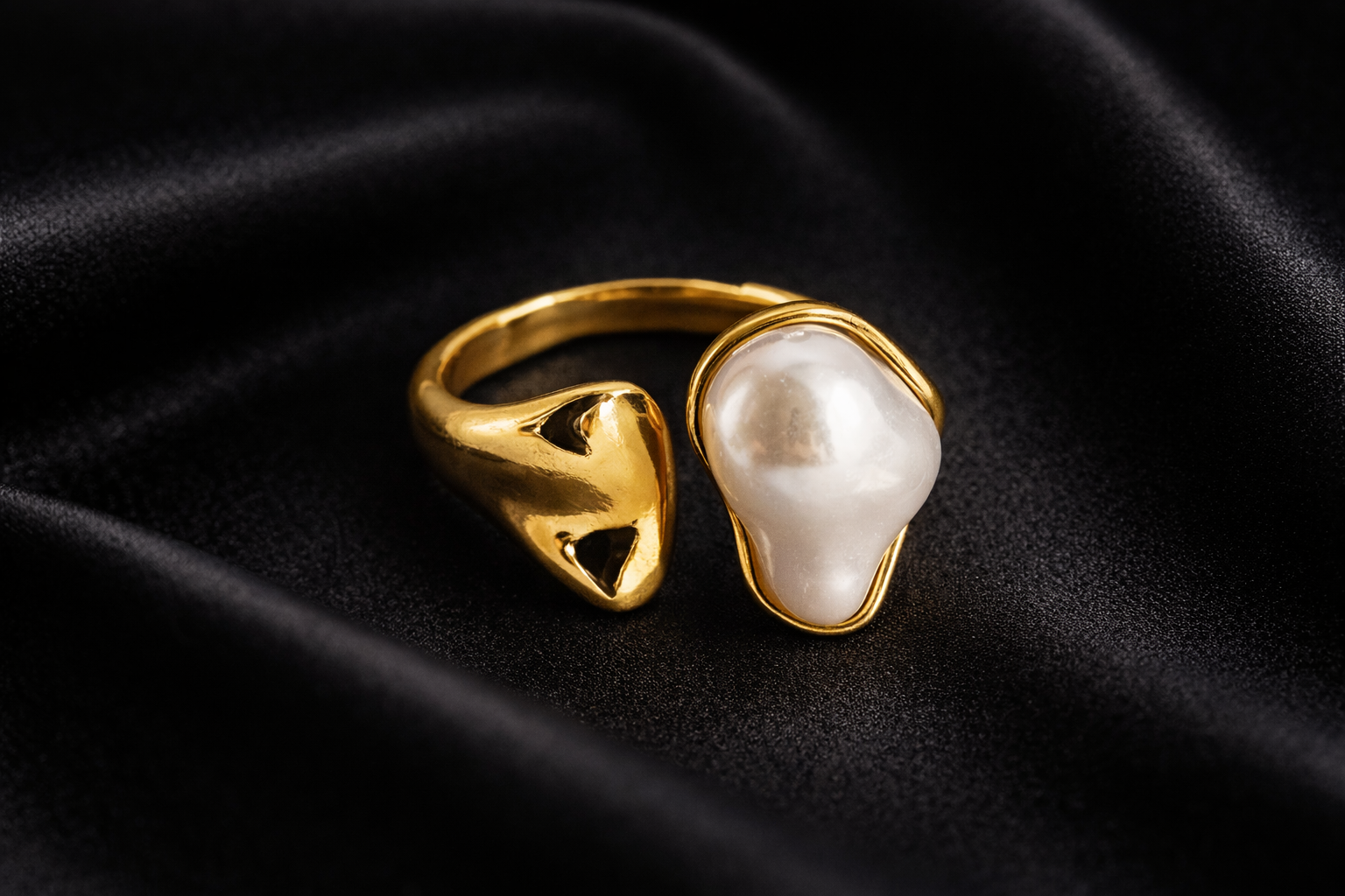 The Noiré Pearl Ring blends a luminous baroque pearl with sculpted gold contours creating a striking piece that embodies modern elegance and quiet luxury.